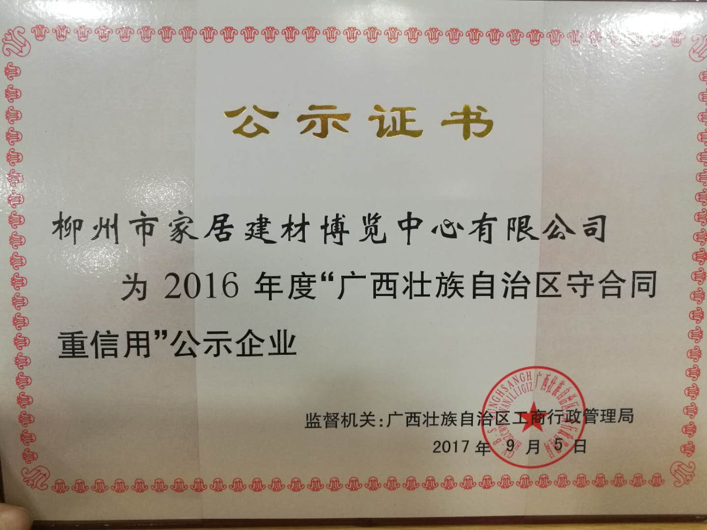 好消息!10月27日上午,在柳州市工商行政管理局召開的2017年度守合同重信用工作會議上,柳州市家居建材博覽中心有限公司榮獲了2016年度“廣西壯族自治區守合同重信用”公示企業榮譽稱號,市工商局副局長韋華廣給柳州家居領獎代表——總裁助理劉小兵頒發榮譽匾牌。此項殊榮的獲得為柳州家居再添一張亮麗名片。
