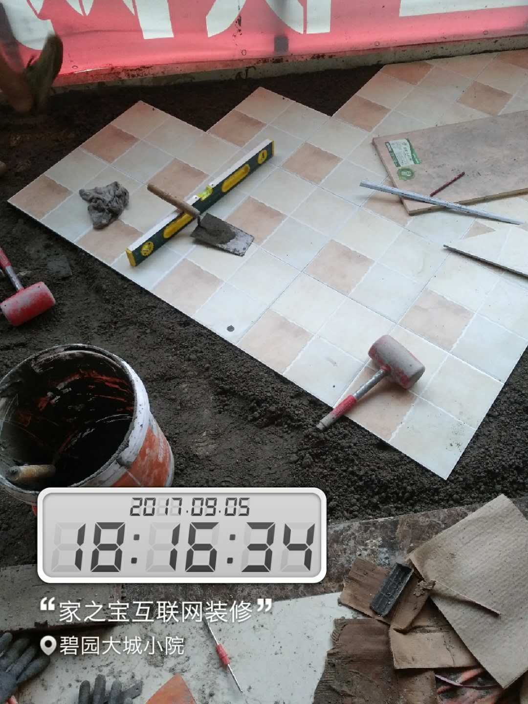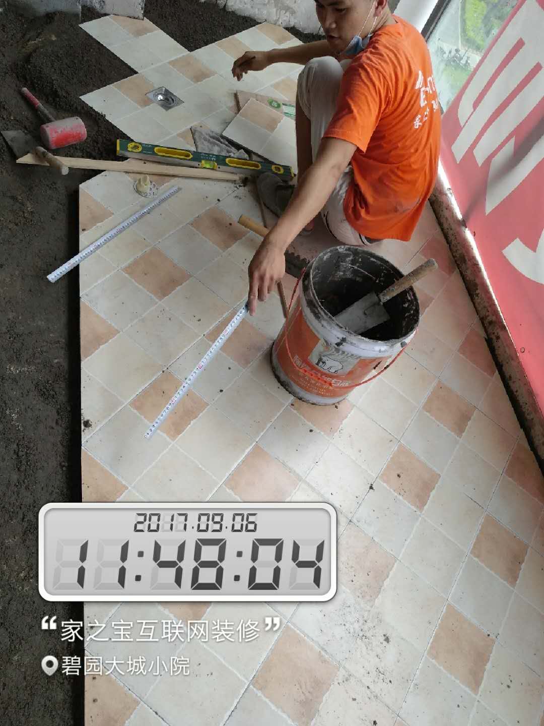 墻磚鋪貼,使用水平儀投射水平線,陽角處采用磨邊45°碰角工藝。